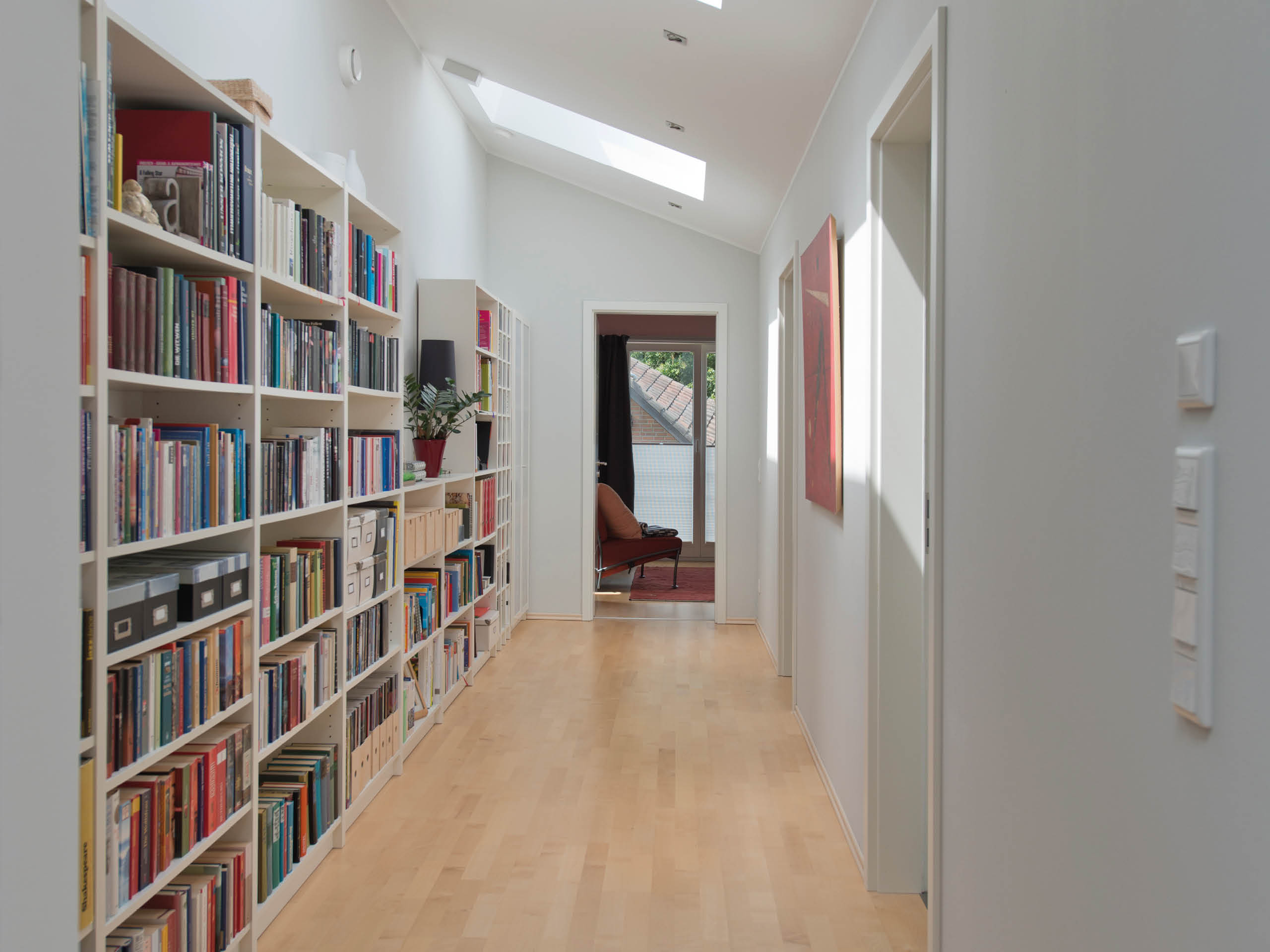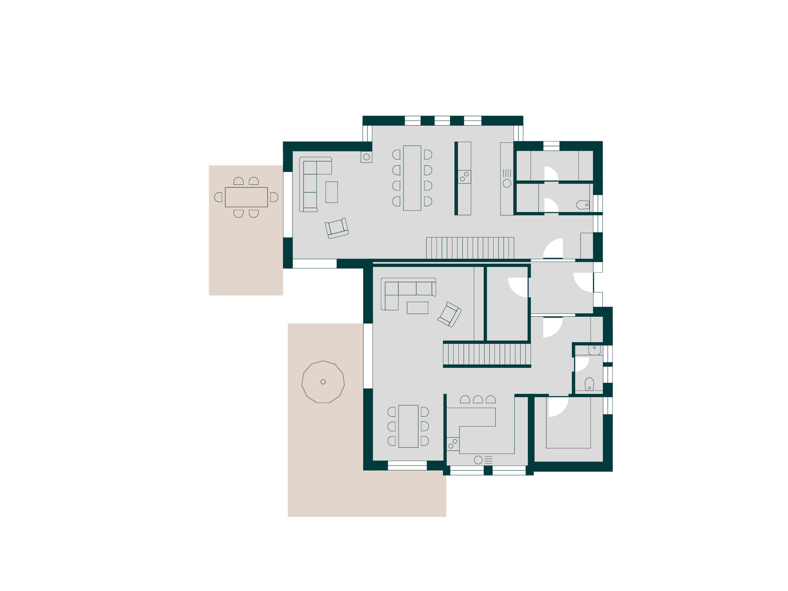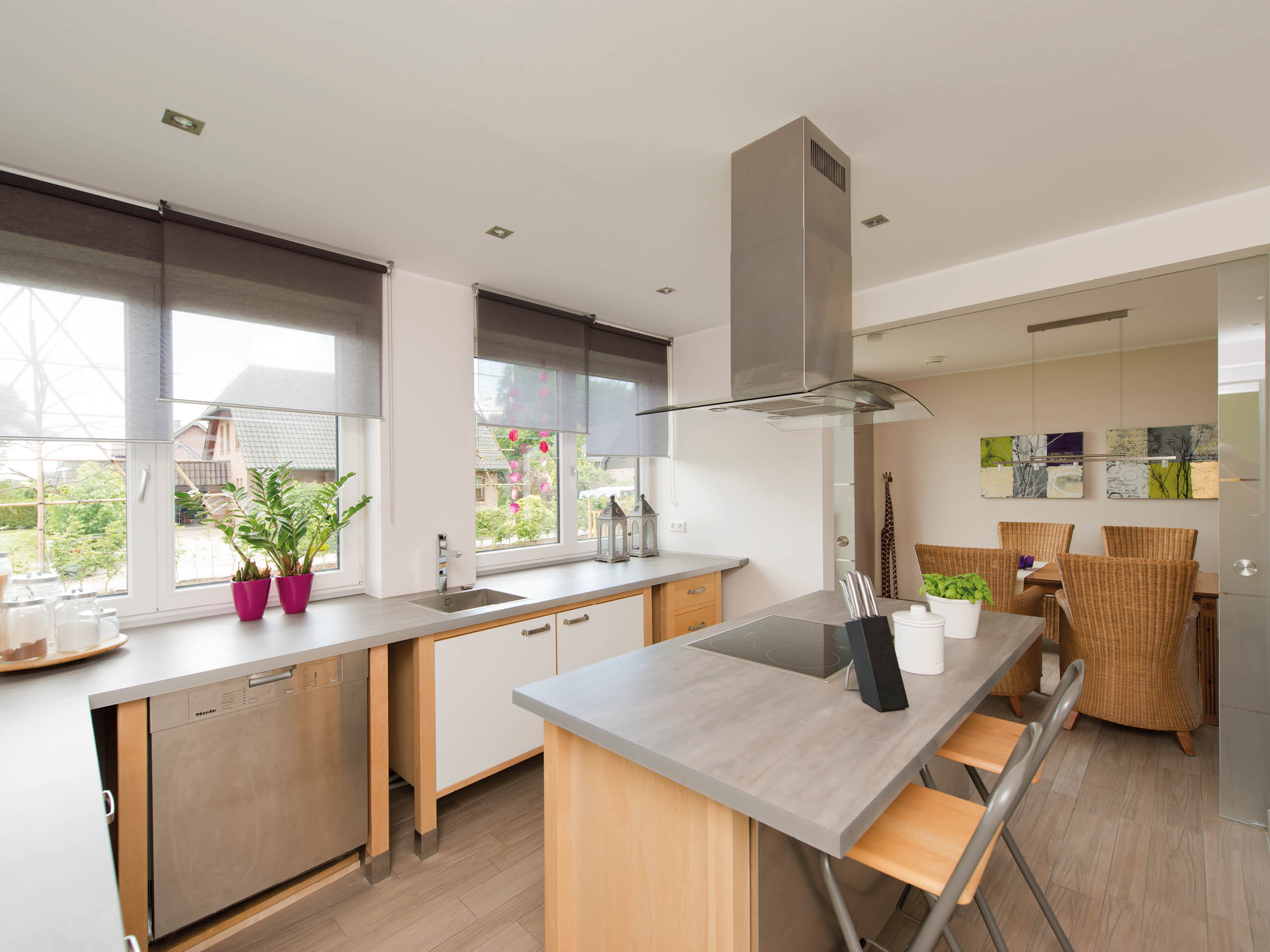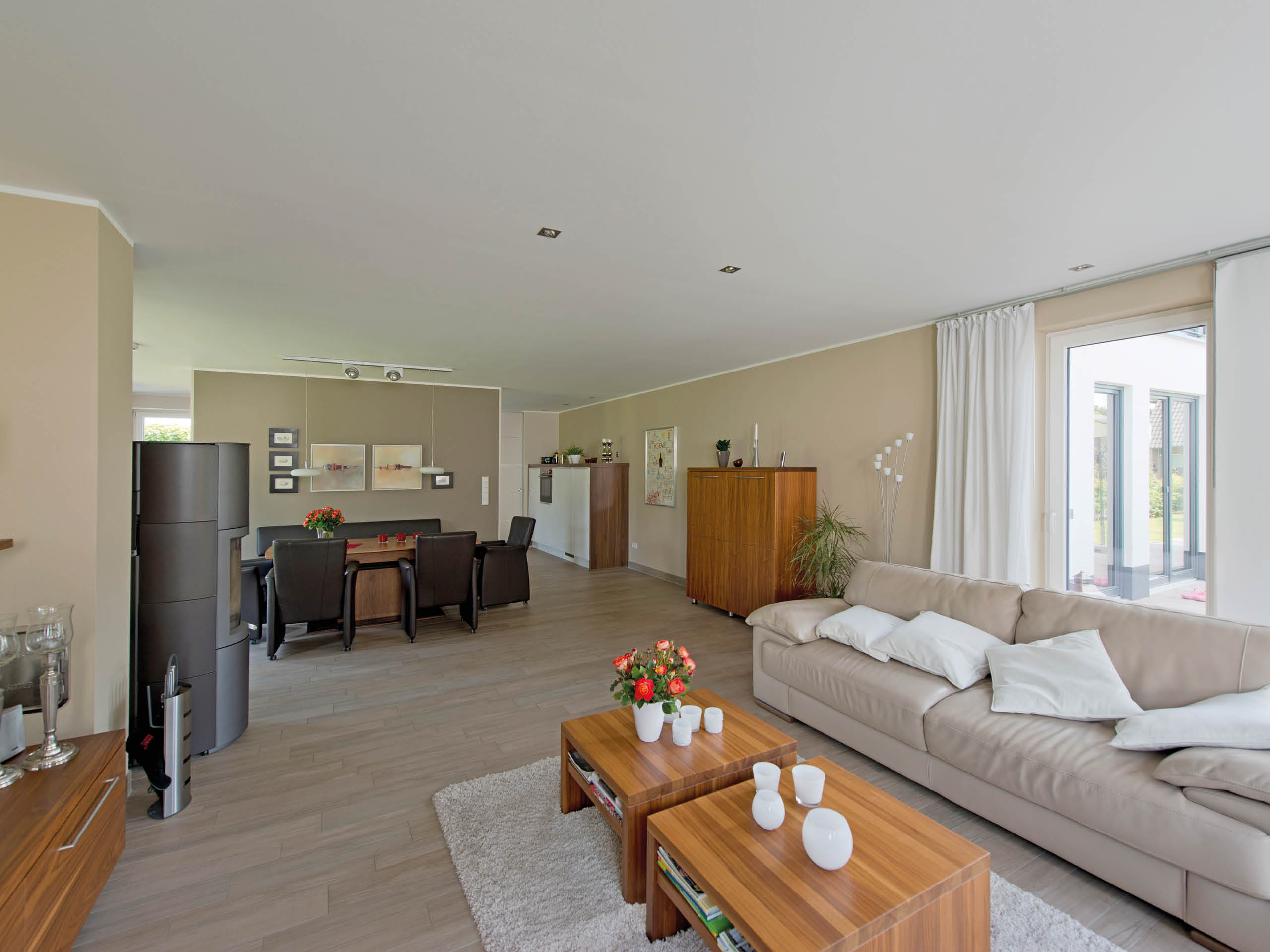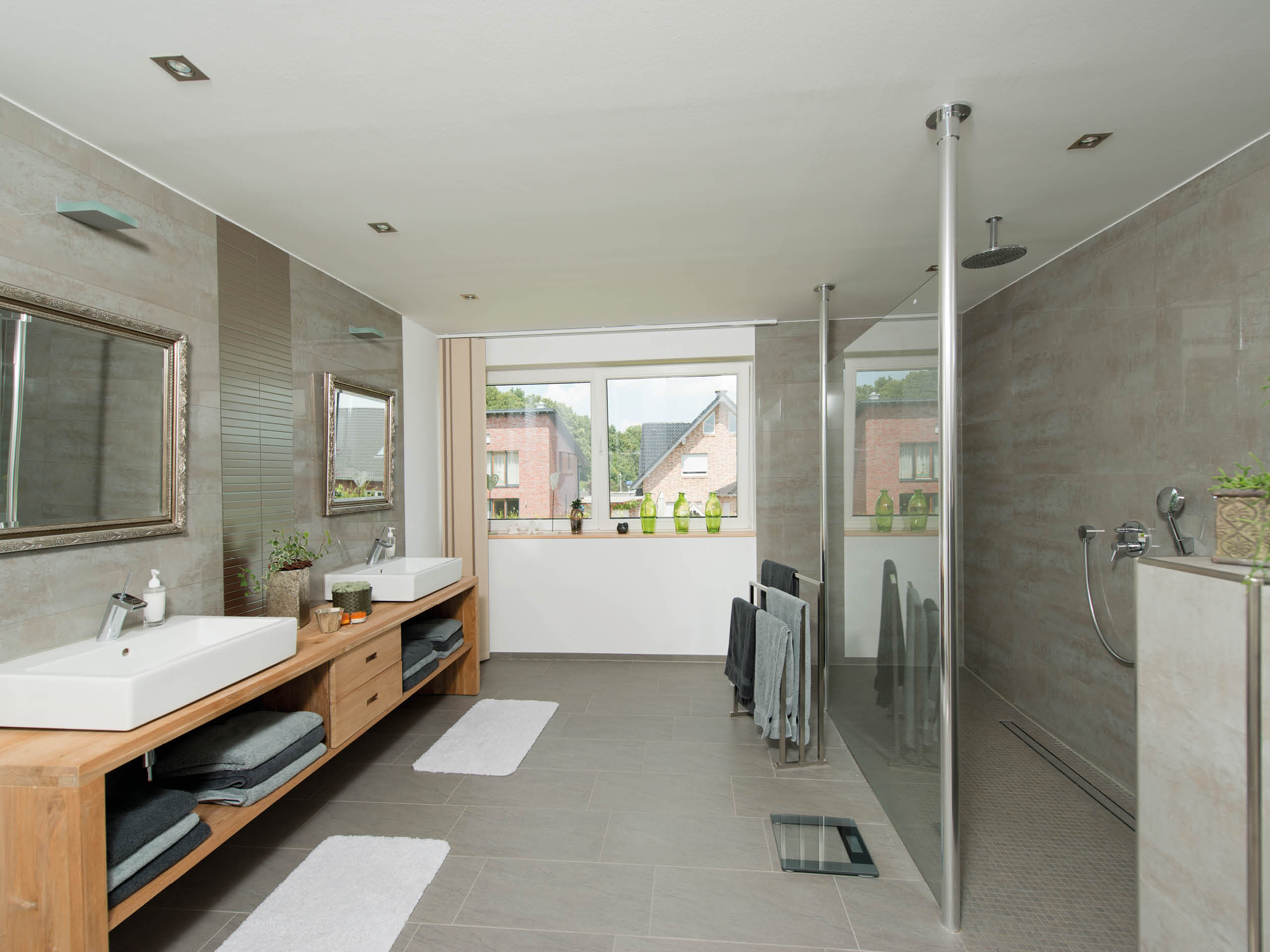 Die Wohnung der jüngeren Generation zeichnet sich durch einen gemütlichen und verwinkelten Wohnbereich aus, während sich die Eltern lange Blickachsen bis in die Diele wünschten. Sie gönnten sich außerdem ein großes und luxuriöses Wohnbad, wohingegen Tochter Silke und ihr Ehemann mehr Wert auf zwei große Kinderzimmer legten. Für die Baufamilien wird eine gemeinsame Terrasse zum sonnigen Treffpunkt, jedoch sind beide Haushälften auch mit einem jeweils eigenen Freisitz ausgestattet. Hier gelingt die perfekte Mischung aus Gemeinsamkeit und Privatsphäre. Beide Familien sind sich einig: „Wir möchten möglichst nachhaltig und energieoptimiert leben – und auch so bauen.“