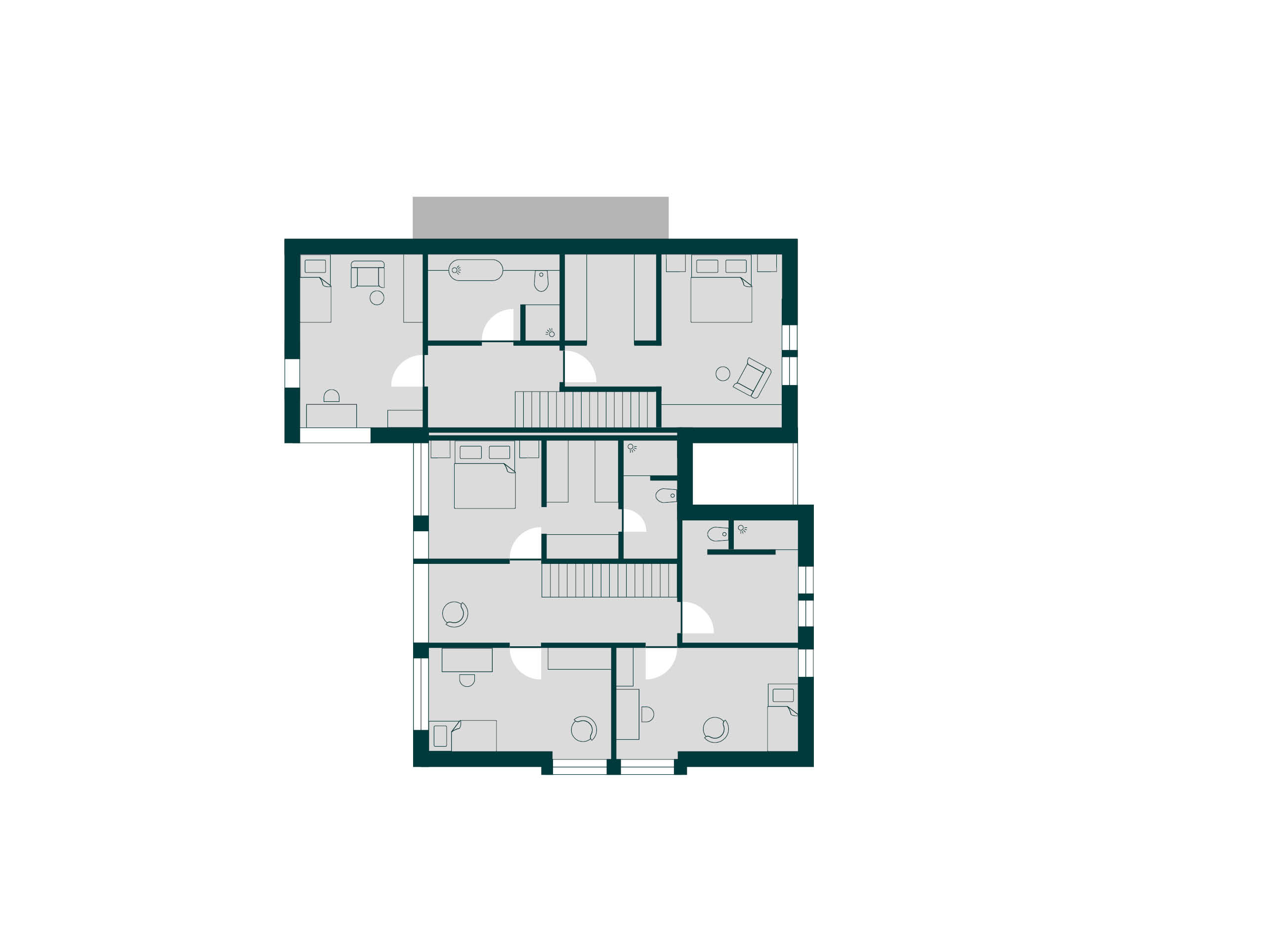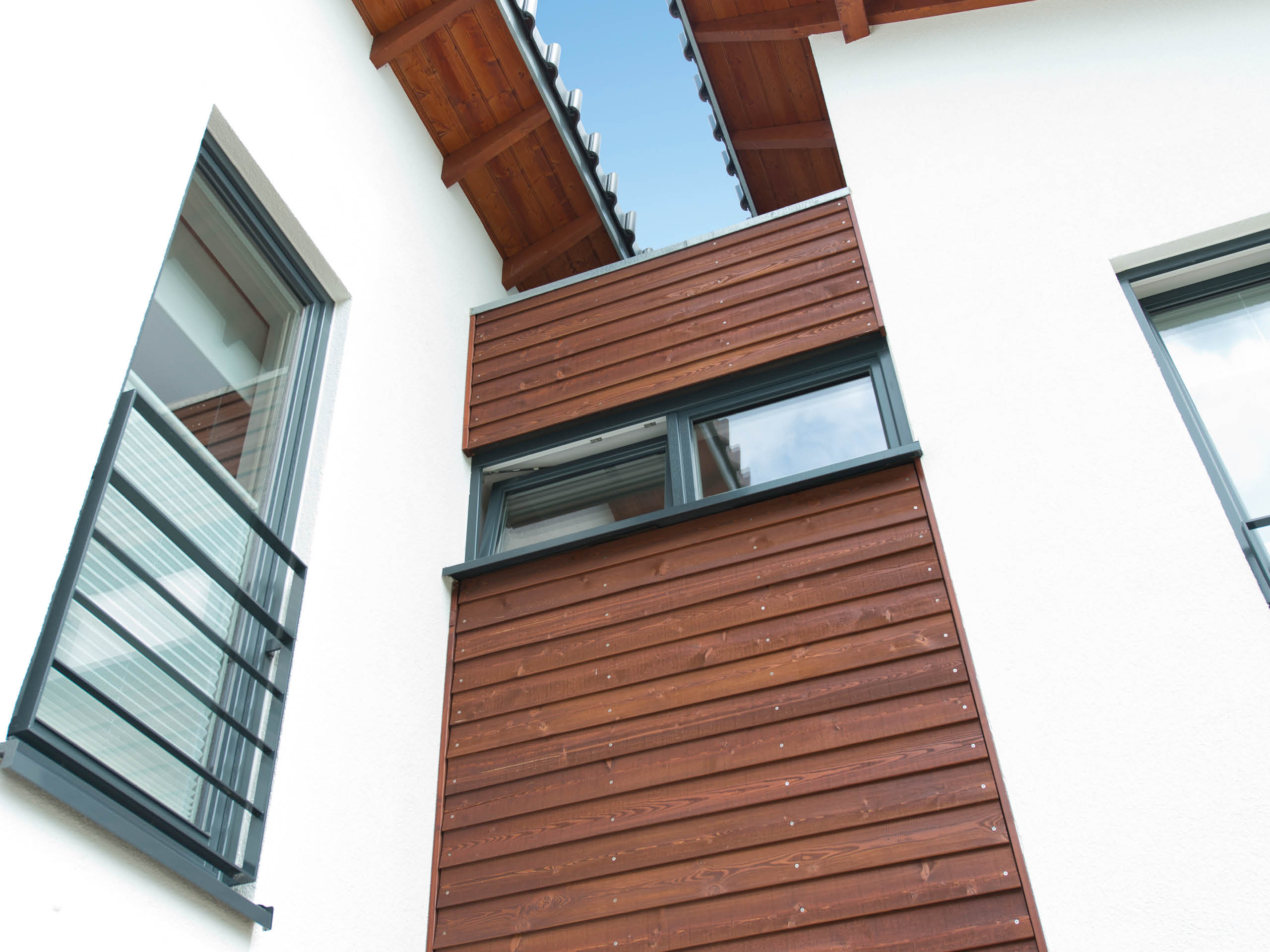 Wie der geteilte Baukörper schon vermuten lässt, haben hier gleich zwei Generationen ihre individuellen und doch gemeinsamen Wohnträume verwirklicht. Jede Hälfte ist dabei auf die jeweiligen Bedürfnisse der Baufamilien zugeschnitten, während ein gemeinsamer Mitteltrakt ein reibungsloses Miteinander ermöglicht.