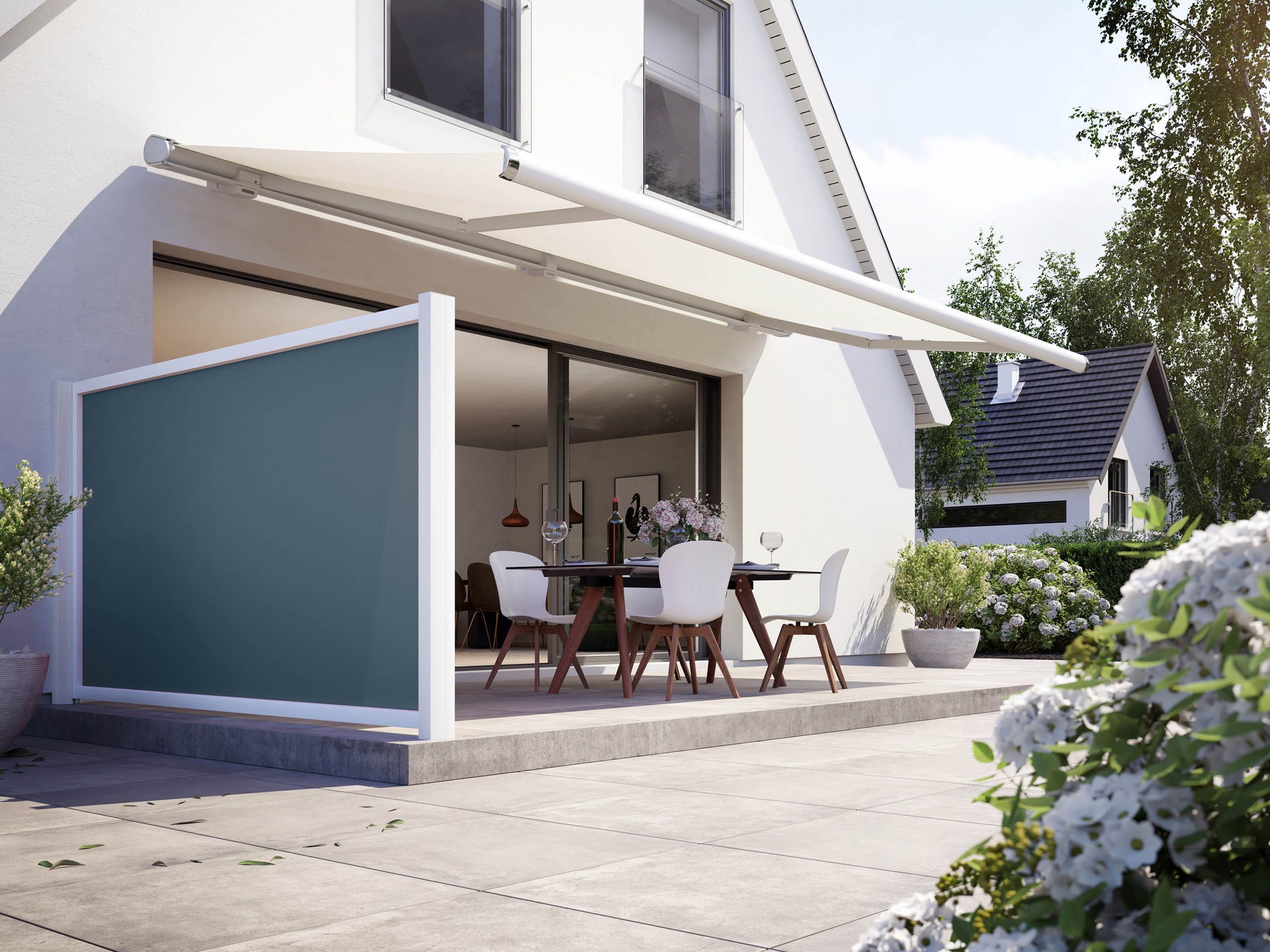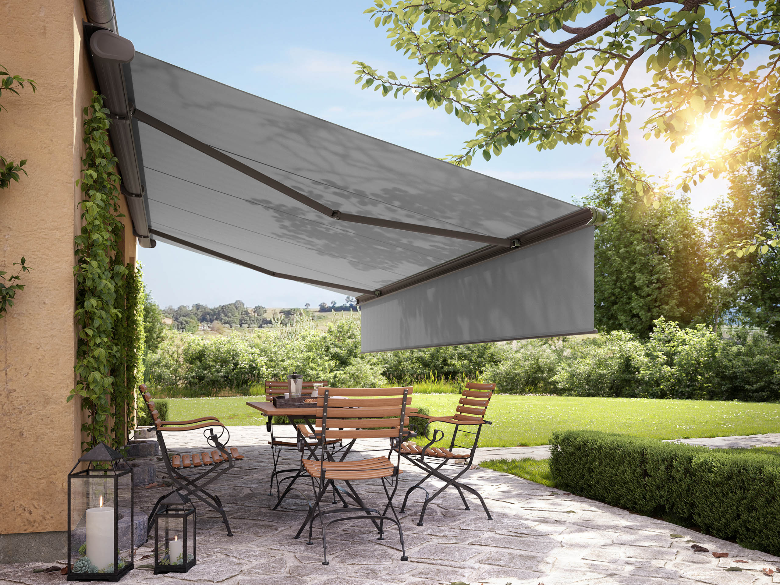So verwandeln Sie Ihre Terrasse in einen schattigen Platz zum Entspannen. Wird sie eingefahren, bewahrt eine geschlossene Kassette das Tuch und die Technik vor Witterungseinflüssen.