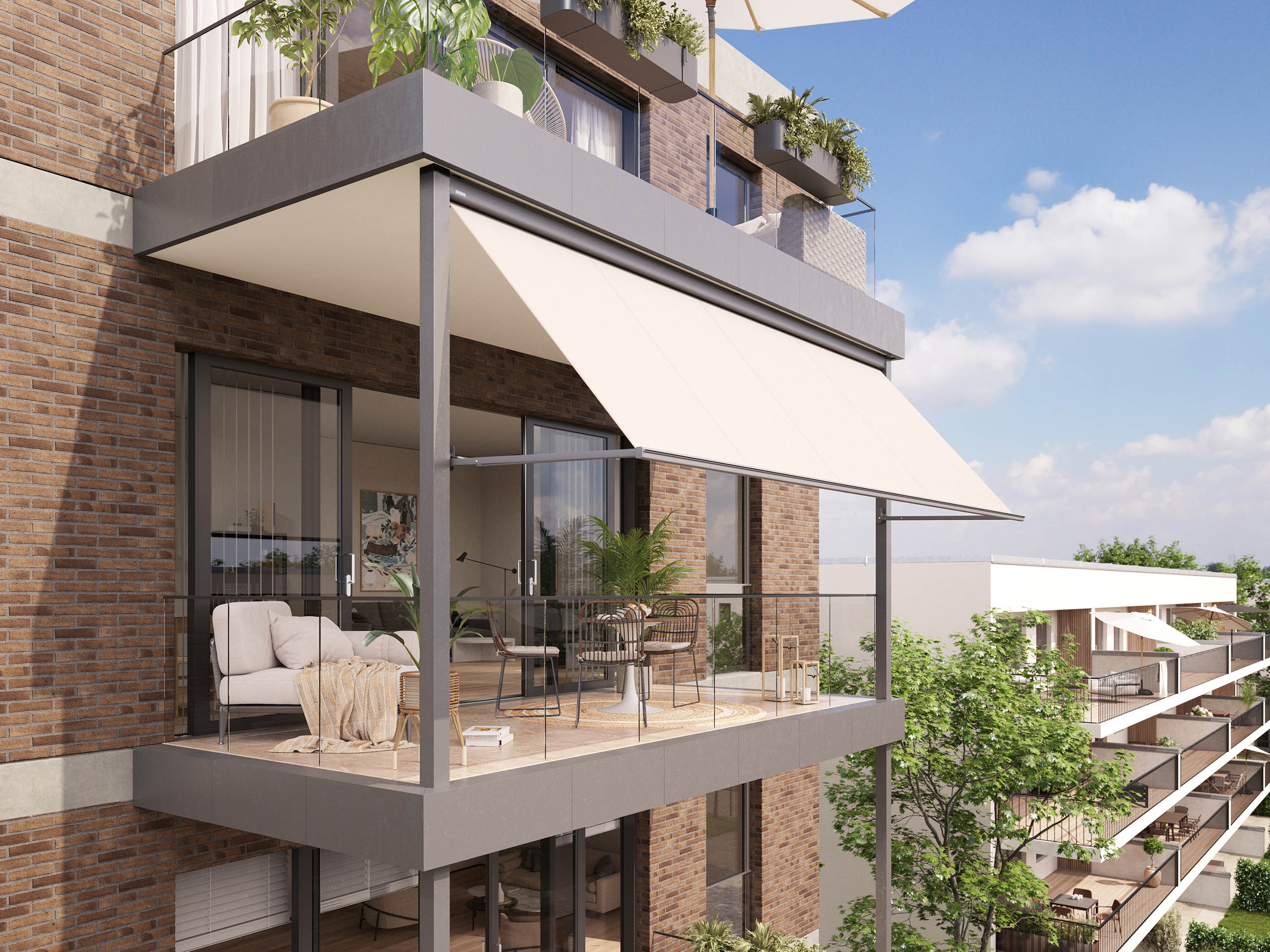 Flexibel an jede Balkonfläche anpassbar, spendet sie an heißen Tagen Schatten und kühlt die Innenräume. Abends und bei kühlerem Wetter sorgt sie für gemütliche Atmosphäre und schützt vor leichtem Wind und Regen.